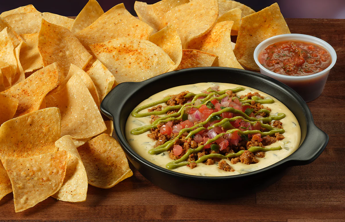 Melted cheeses, scratch-made chorizo, pico de gallo, jalapeño sauce, fresh tortilla chips and a side of salsa.