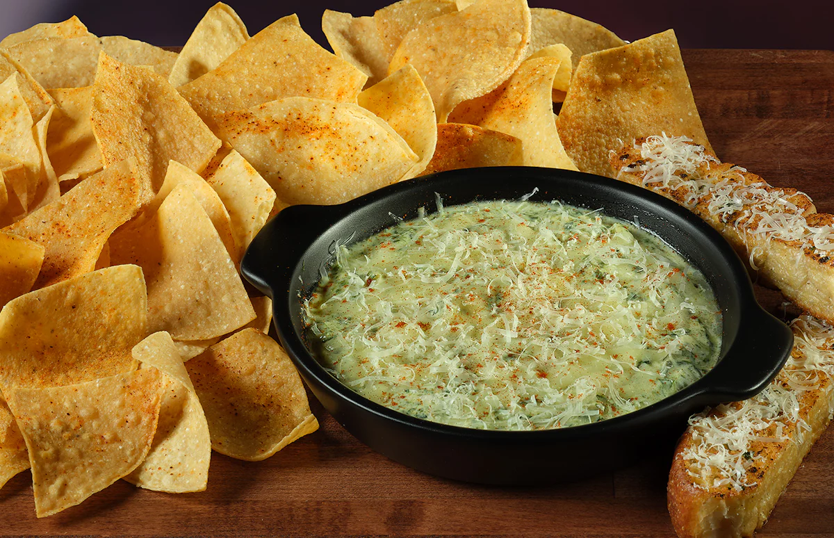Scratch-made creamy spinach dip with poblanos, topped with Parmesan and a blend of cheeses. Served with tortilla chips and garlic focaccia bread