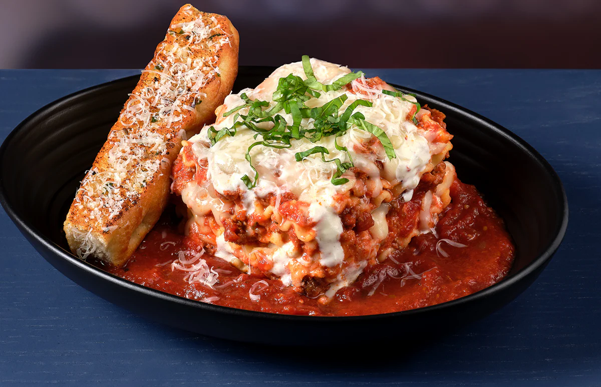Layered pasta with Italian sausage, cream sauce, Bolognese, mozzarella, provolone and Parmesan cheese. Served with scratch-made garlic focaccia bread (add 180 cal.)