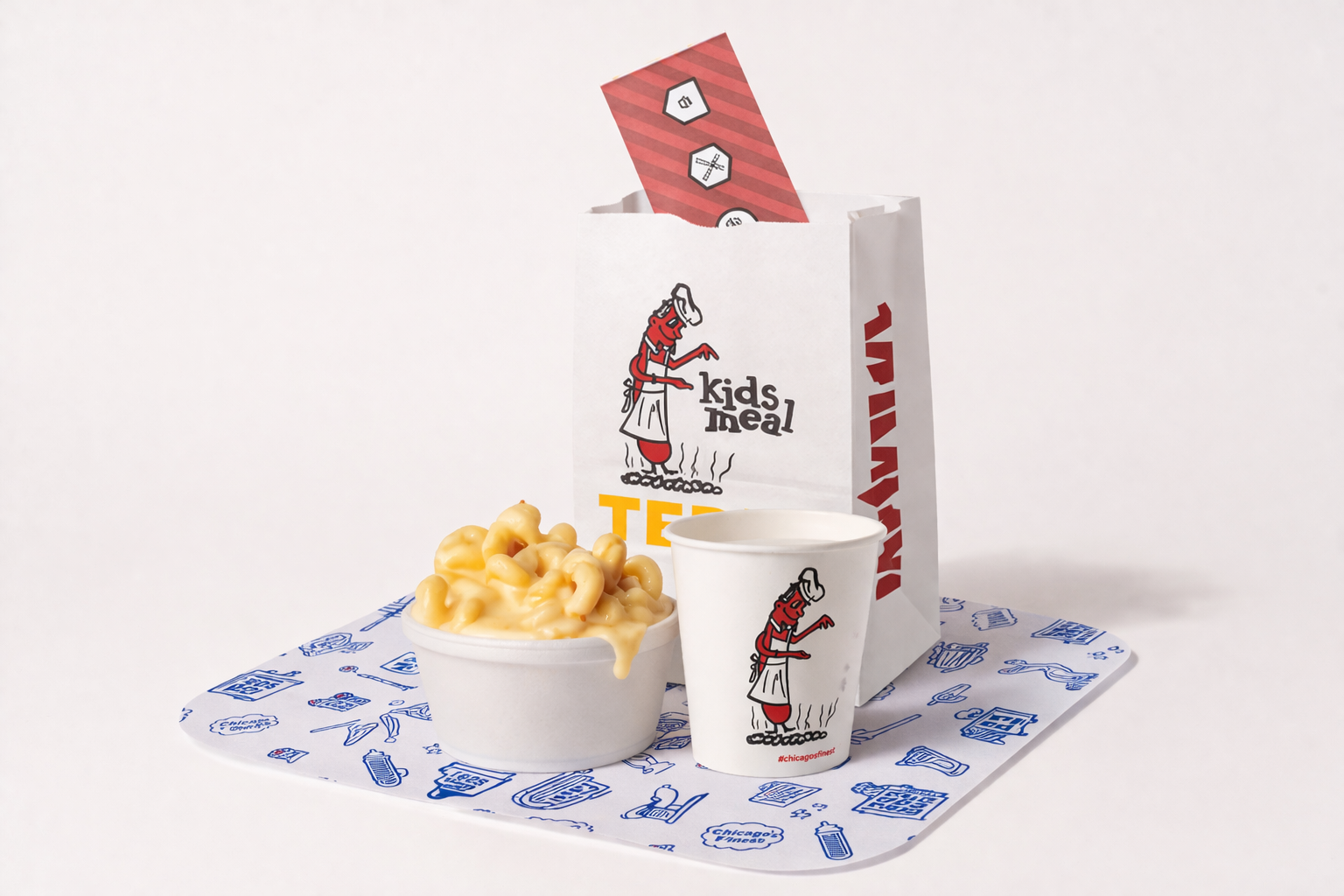 Mac-n-Cheese, fries or apple sauce, and a kiddy sized drink or milk.