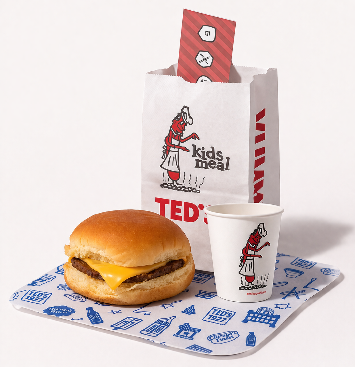 1/5 lb certified Angus beef burger, fries or apple sauce, and a kiddy sized drink or milk.